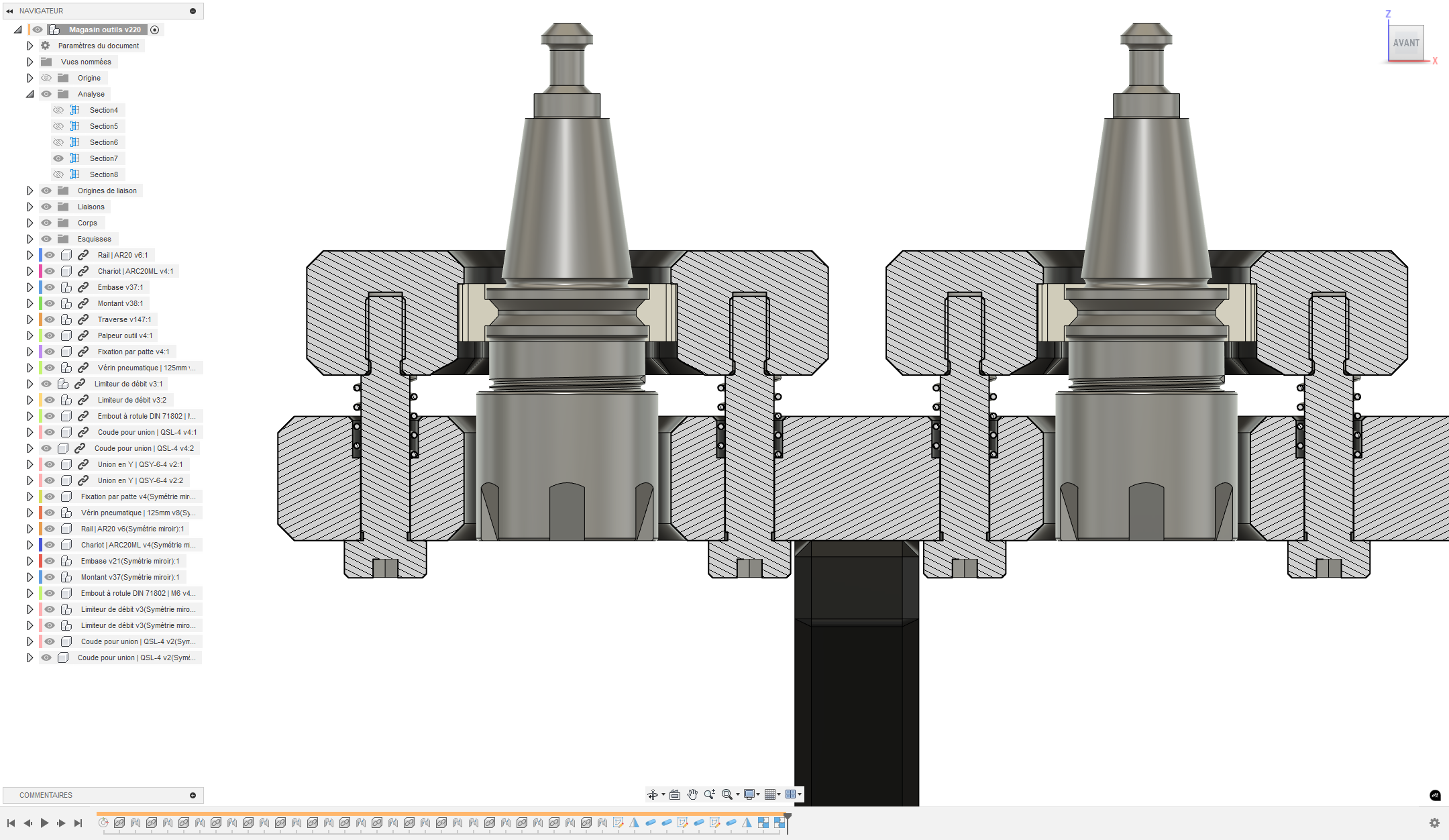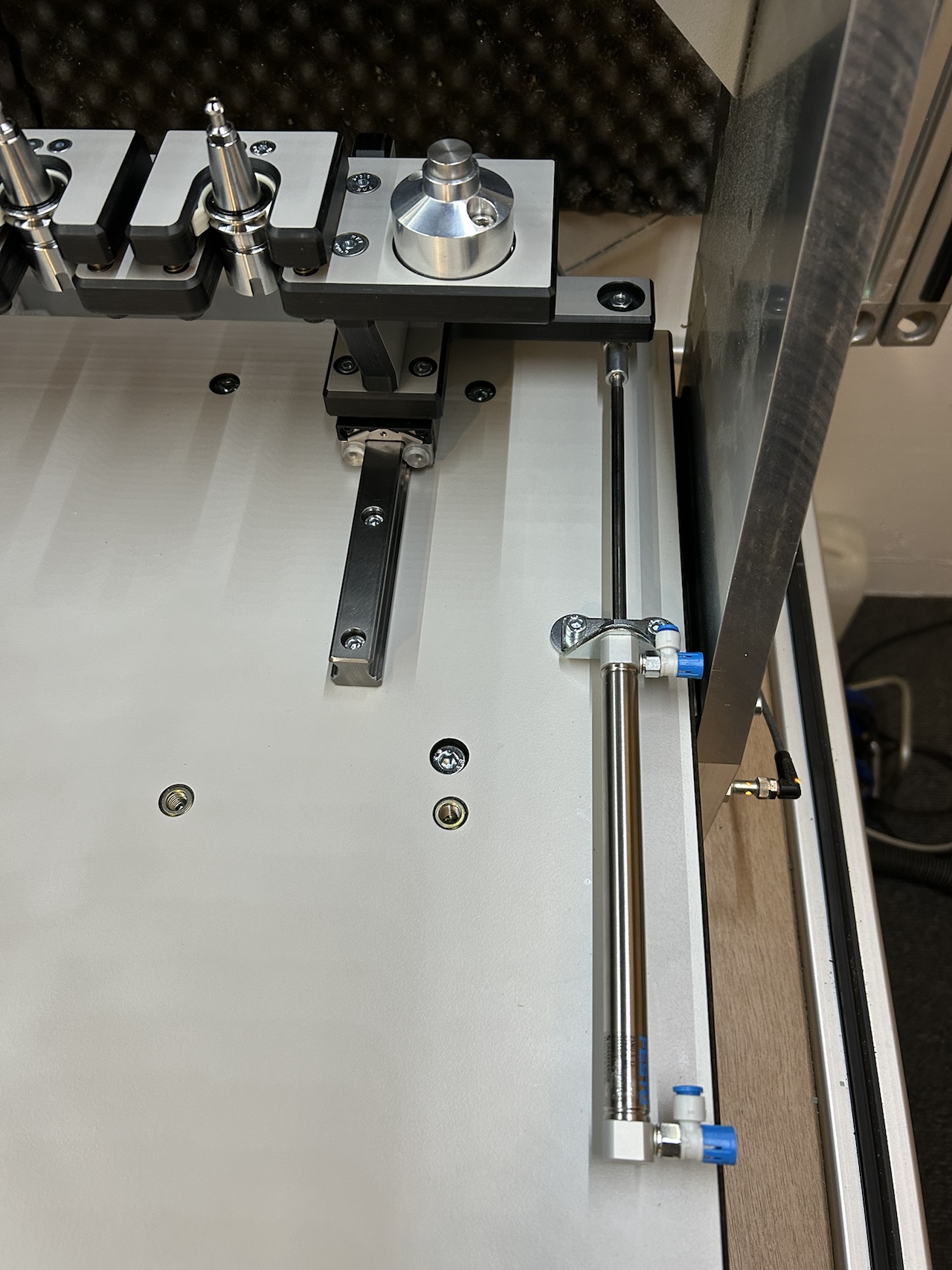Initialement prévu pour 8 outils, le magasin n'en contiendra finalement que 7 afin d'y intégrer le palpeur d'outil. Cette configuration a plusieurs avantages, le palpeur n'empiète pas sur la surface de travail et le temps de palpage est plus court car un retrait du magasin n'est pas nécessaire entre la prise et la mesure de l'outil.
