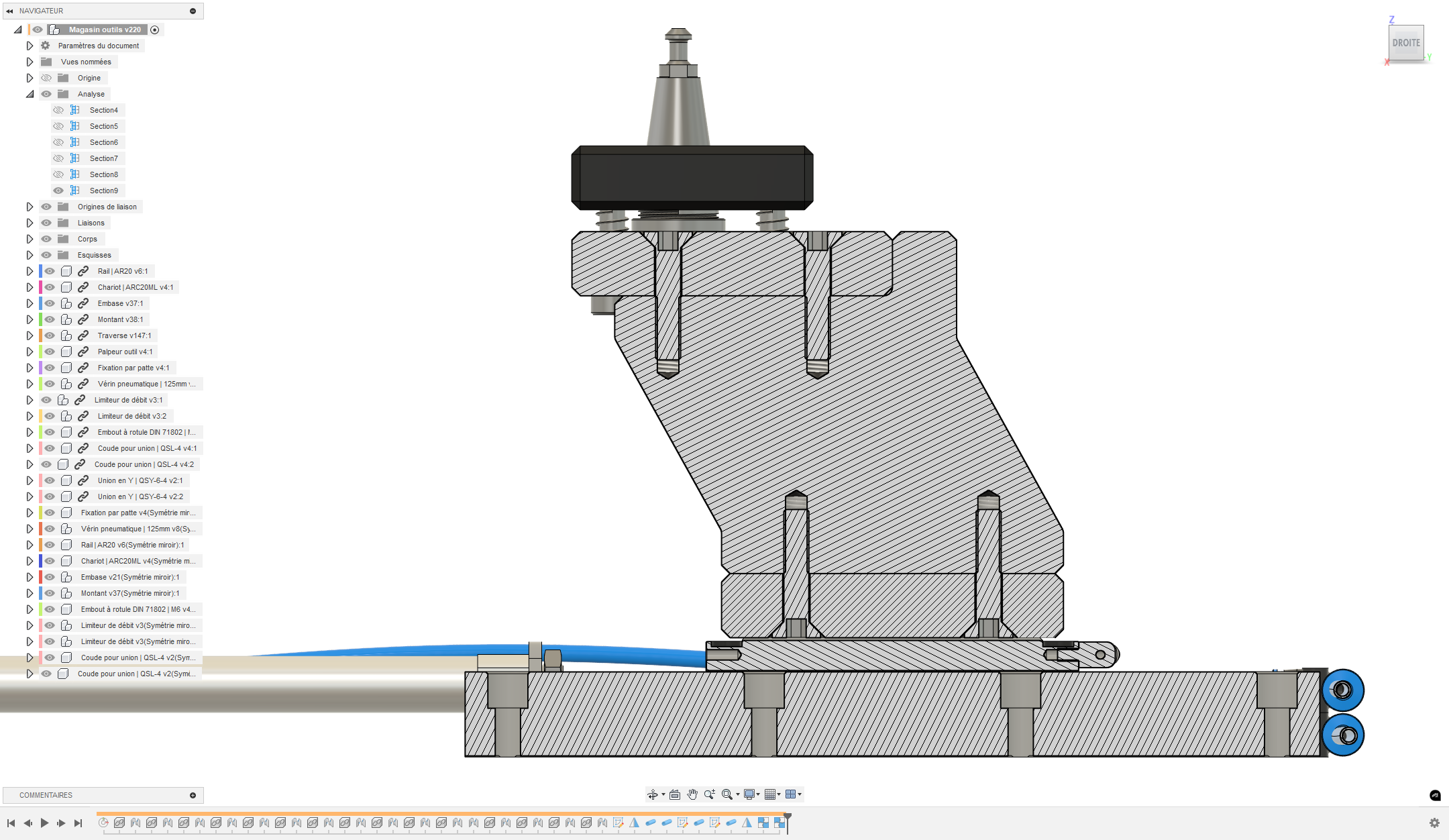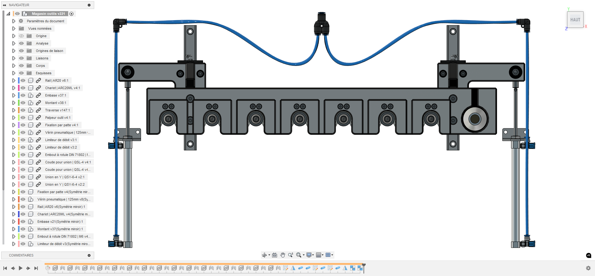 L'idée de ce projet est de réaliser un magasin d'outils rétractable afin de conserver la totalité de la surface de travail de la machine. Le système doit être compact, rapidement actionnable et si possible relativement simple dans sa cinématique pour éviter de complexifier inutilement le tableau de commande qui existe déjà.