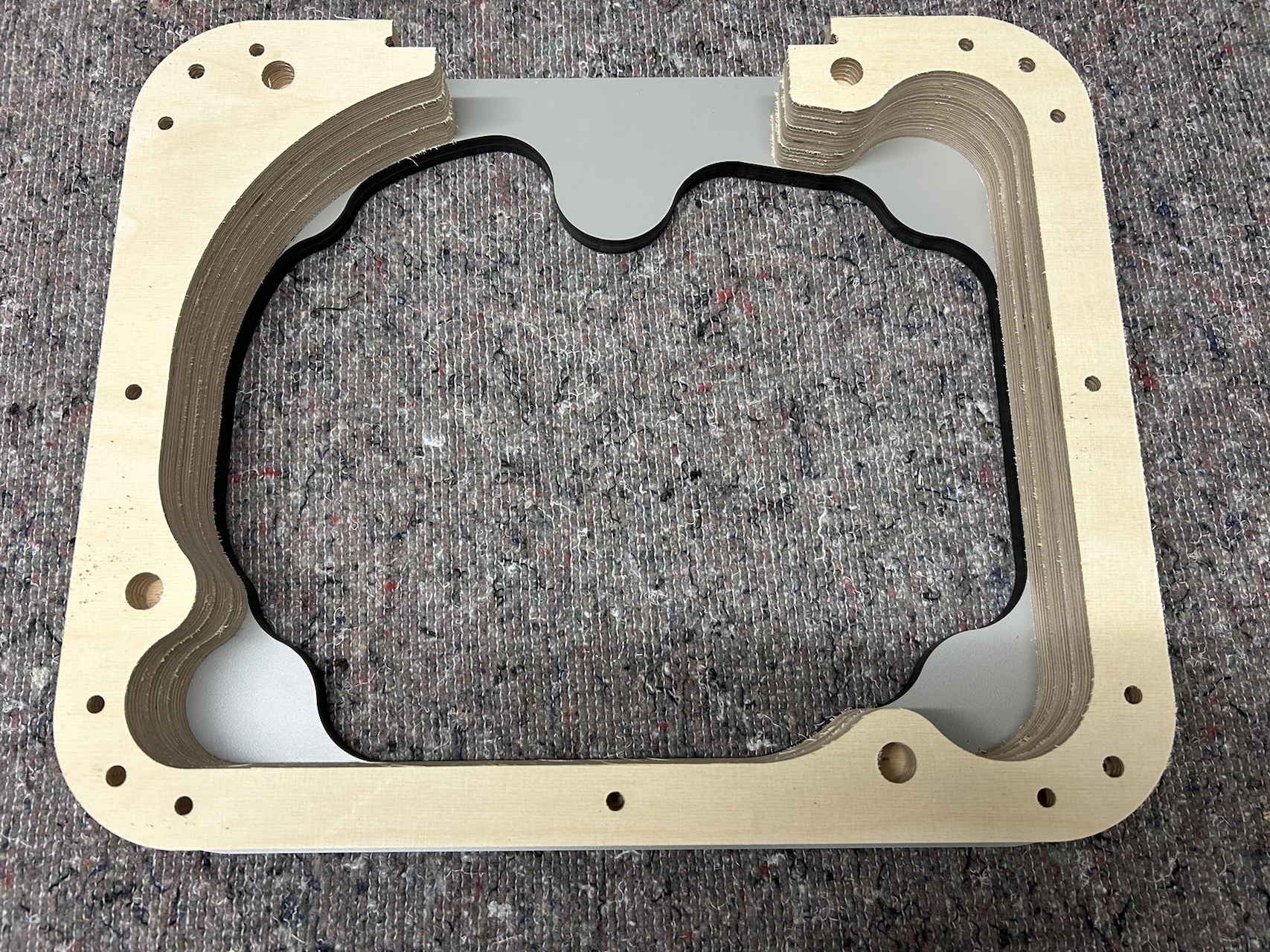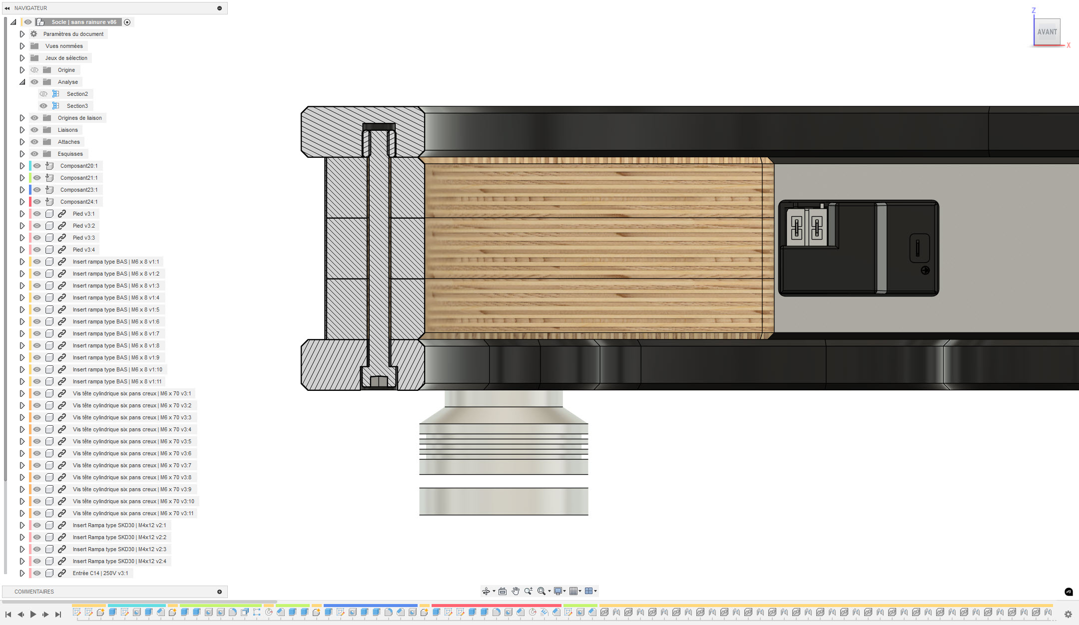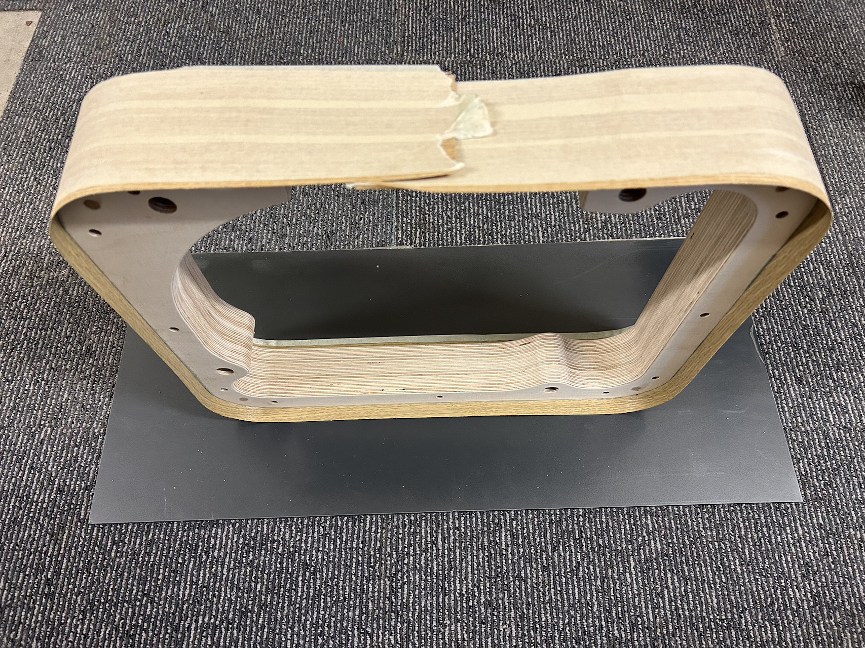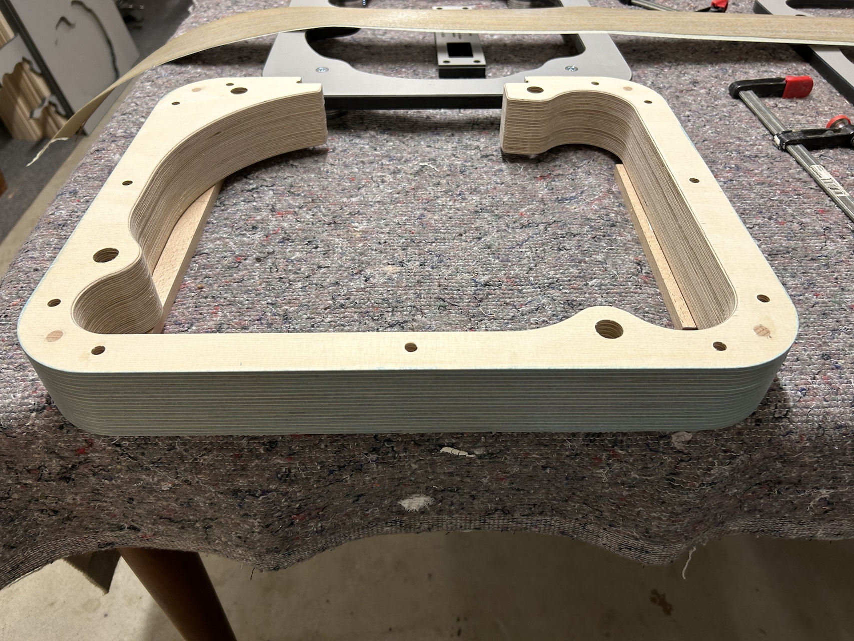 L'âme est constituée de 3 pièces en multiplis de 18mm. Des tourillons de guidage sont percés dans les angles pour faciliter l'alignement lors du collage.